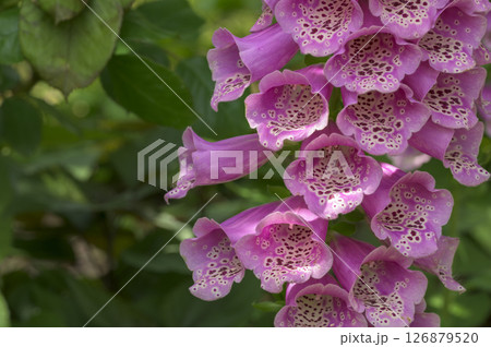 春に咲く公園の花、薄紫かピンクのジギタリス、狐の手袋、釣鐘のような花の形