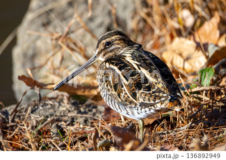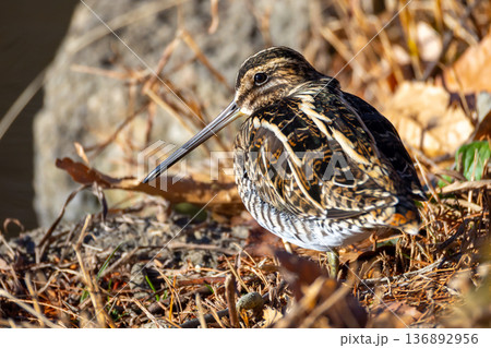 埼玉県川越市池辺 川越水上公園 修景池(ボート池)の水辺を歩くジシギ類のタシギ
