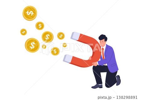 Businessman using a big magnet to attract money. Vector artwork illustration depicts the concept of making money, successful business idea, financial success, gain, and profit.
