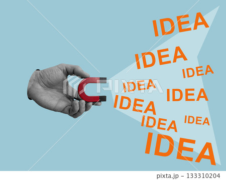 A hand with a magnet attracts money. Attracting customers and business success. Modern collage.