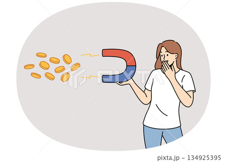Money attraction. Woman holdings magnete. Business lady attracting investment. Magnetic power, wealth and gold coins vector illustration