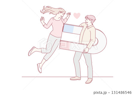 Woman attracts man with magnet. Finding romantic relationships. Meeting website. Magnetic love, valentines day card, attractive pretty boy. Cartoon flat style isolated vector concept