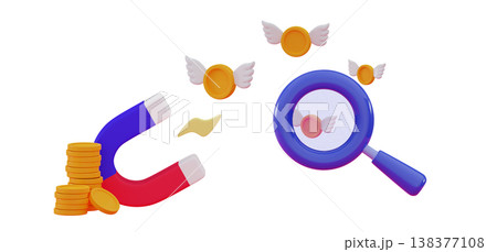 Horseshoe magnet attracting a stack of coins with a dollar sign symbolizing financial gain. Ideal for financial growth, wealth accumulation, investment strategies, business success, economic