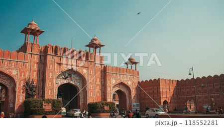 原色のサリーを来た女性達が行きかうジャイプルの城門前