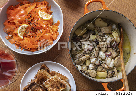 海鮮とじゃが芋のアヒージョと、キャロットラペの食卓