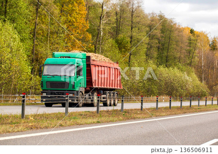 Green dump truck with red trailer loaded with potatoes driving on highway road during autumn season, forest trees on background, cloudy sky