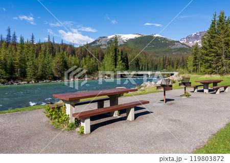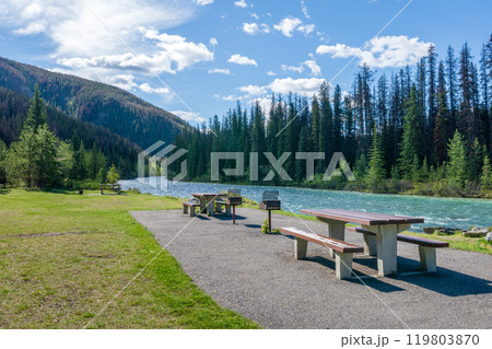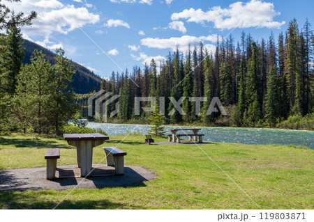 A picnic table and benches on the green meadow next to a river. Mountain and forest in the background. Maligne River in Jasper National Park, Alberta, Canada. Canadian Rockies.