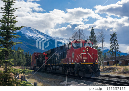 カナディアン・ナショナル鉄道の貨物列車。カナディアンロッキー、ジャスパー国立公園。ジャスパー、アルバ