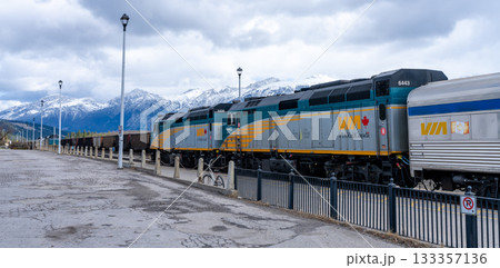 ジャスパー駅のプラットホームに停車するVIA鉄道 F40PH-2D 旅客列車。ジャスパー、アルバータ
