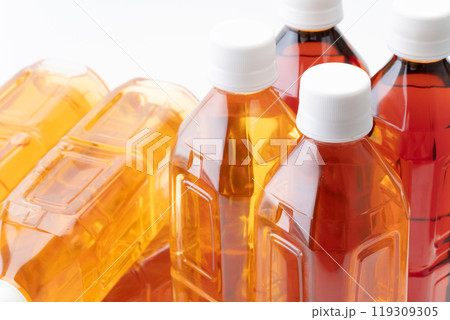 色々な種類のお茶のペットボトルのクローズアップ