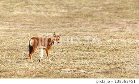 Rare endangered Ethiopian Wolf (Canis simensis) foraging in highland grasslands