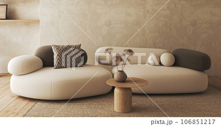 Boho beige livingroom with dry plant and wooden table view background. Light modern japanese nature interior. 3d rendering. High quality 3d illustration