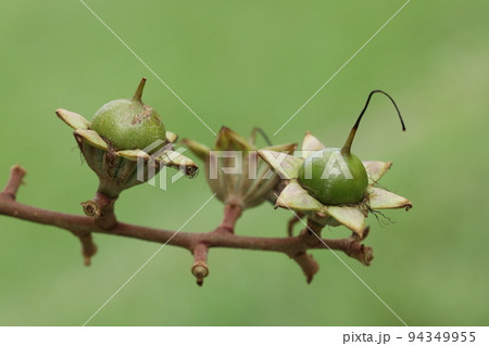 自然 植物 オオバナサルスベリ、未熟な果実。立派な萼片がランプシェードの様です