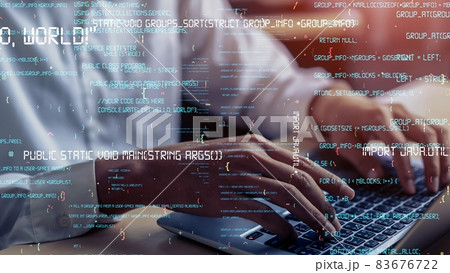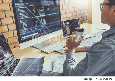Developing programming and coding technologies and engineering development. Programmer or developer create code. Computer screen with codes. Developer work with task, coding software using pc