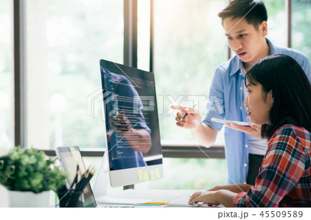 Woman asian software developers are analyzing together about the code written into the program on the computer in office room.