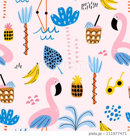 Seamless tropical pattern with flamingo, palm and tree summer elements. Vacation style pink vector texture.
