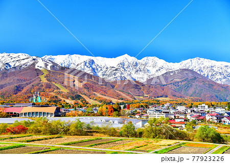 信州白馬村白銀のジャンプ台と北アルプス五竜岳青空に映える