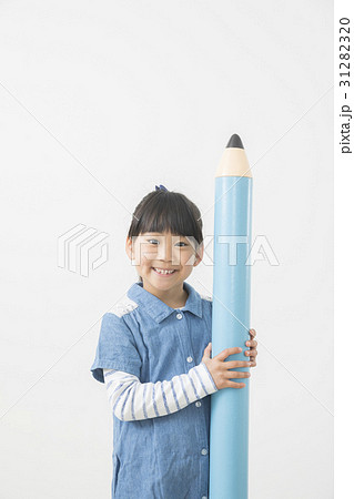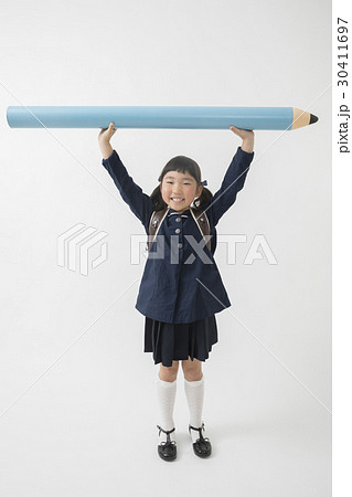 制服を着て巨大鉛筆を持ち上げる小学生 学習 勉強 塾イメージ