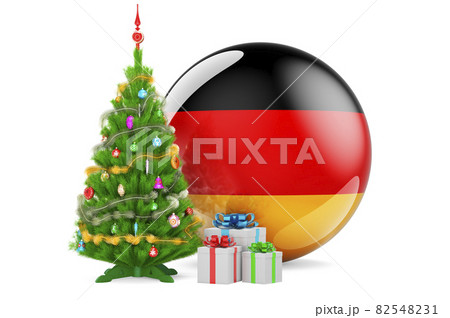 Christmas and New Year in Germany, concept. Christmas tree and gift boxes with German flag, 3D rendering