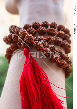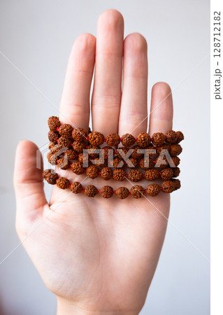 Rudraksha beads, a traditional accessory for meditation and spiritual practices made of natural seeds strung on a thread
