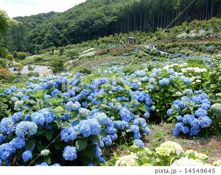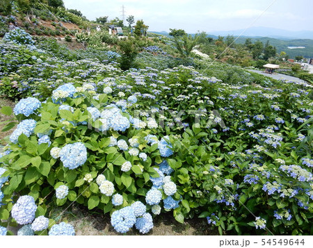 福島県石川郡平田村蓬田新田 蓬田岳麓のジュピアランドひらた近くの青い紫陽花やガクアジサイの群生