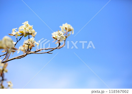 春の樹花・ジューンベリーの純白の花・青空バック横位置