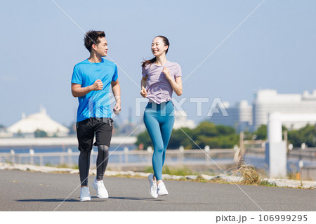 公園で話しながらランニング・ジョギング・トレーニングするスポーツウェアを着たアジア人の男女(話す)