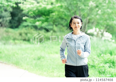 公園でジョギングしてダイエットするランナーのアジア人女性