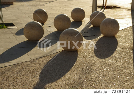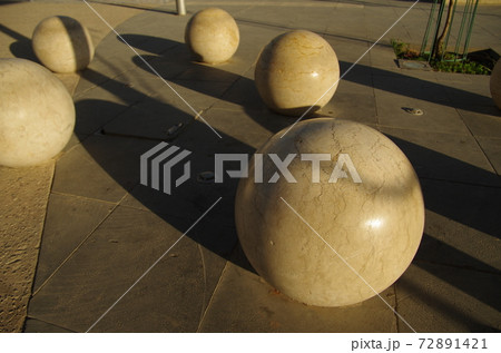 【ヨルダン】アンマン、ダウンタウンの広場に置かれた石でできた球体のオブジェと陽光が当たってできた影