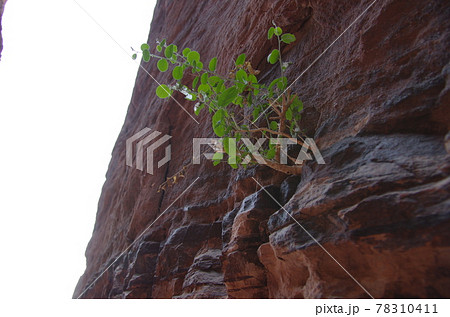 【ヨルダン】ワディラム、砂漠の岩肌に生える緑の葉を蓄えた低木