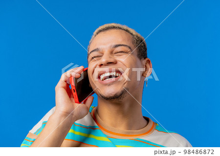 Smiling positive man talking by phone, nice joke, smiling. Young guy on blue background. Having