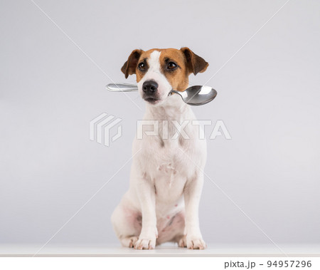 Portrait of a dog Jack Russell Terrier holding a spoon in his mouth on a white background. Copy space.