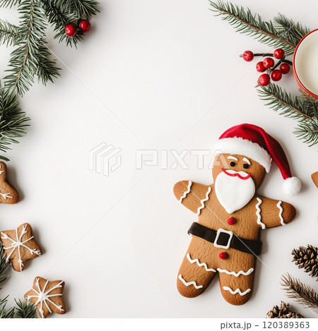 Christmas and New Year seasonal square template design with decorations and copy space for social media post. A cute gingerbread man with decorations on plain white background. AI generated.