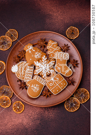 Delicious fresh sweet Christmas gingerbread with festive ornaments