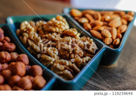 different types of nuts, Various snacks for the New Year table in a plate in the shape of a Christmas tree.