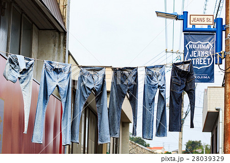 児島ジーンズストリートの吊るしているジーンズを撮影