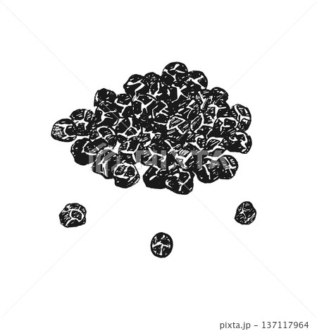 Pile of black peppercorns. Vector. Graphic illustration. Black pepper. Spicy condiment and seasoning. Hand drawn ink sketch. Perfect for menu, recipes, packaging, logo. Isolated on white background