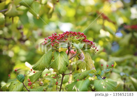 Viburnum, flowering plant in moschatel family, Adoxaceae or Viburnaceae, previously included in honeysuckle Caprifoliaceae. Ripening red berries, edible fruits. Green leaves dangle in wind. Karelia