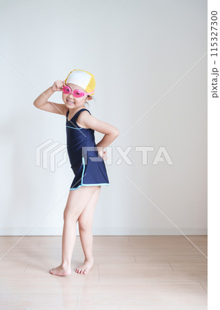 女の子のイラスト。スイムキャップとゴーグルをした競泳スタイル。