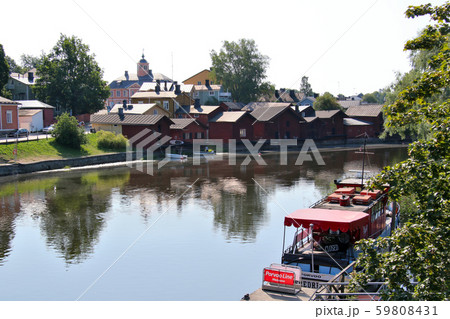 フィンランド ヘルシンキ近郊の古都 ポルヴォーのポルヴォー川 川沿いの赤い倉庫群 を遠くに望む