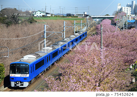 河津桜と京急2100形電車 ブルースカイトレイン