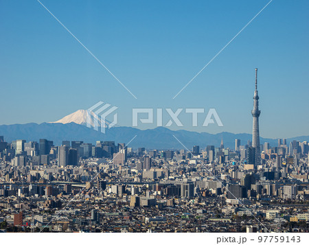 快晴の冬の朝 アイ・リンクタウン展望施設から望む東京スカイツリーと富士山