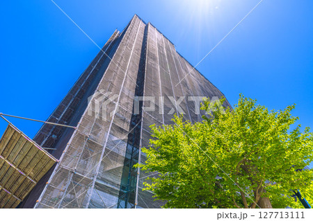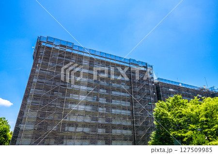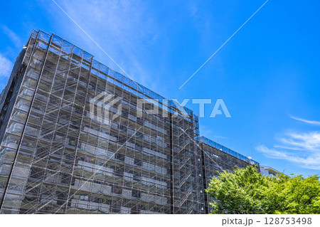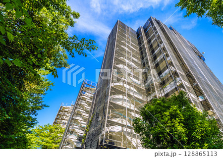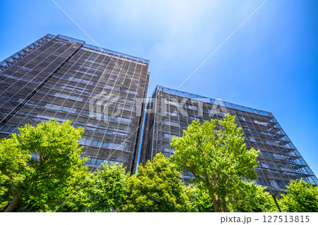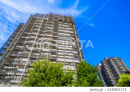日本の横浜都市景観 マンションの補修や点検等、足場や防護ネットなどを望む…