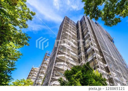 日本の横浜都市景観 マンションの補修や点検等、足場や防護ネットなどを望む…