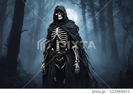 月夜の森に立つマントをはおったガイコツの戦士