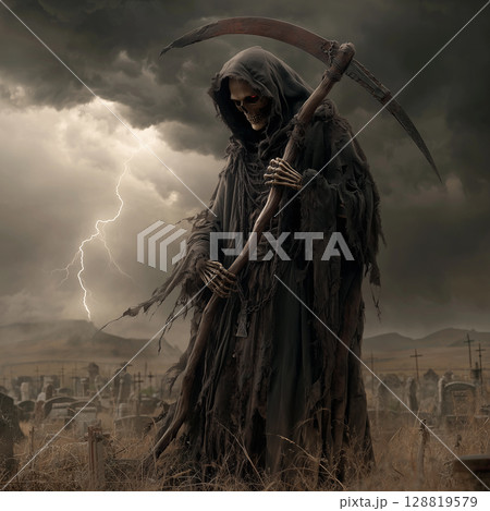 荒廃した暗い空の下に立つ鎌を持った死神「生成AI」