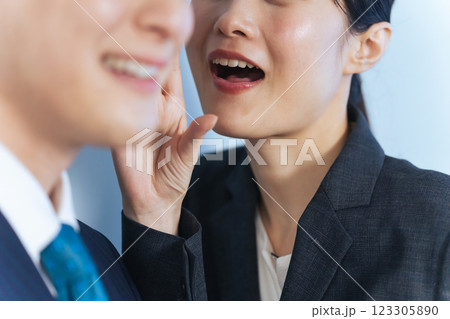 内緒話をする男女ビジネスパーソン