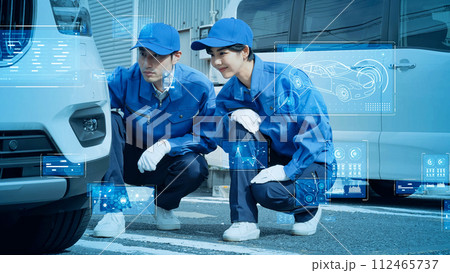 自動車の車内でタブレットを使い・メンテナンス・修理・チェック・点検する男性作業員