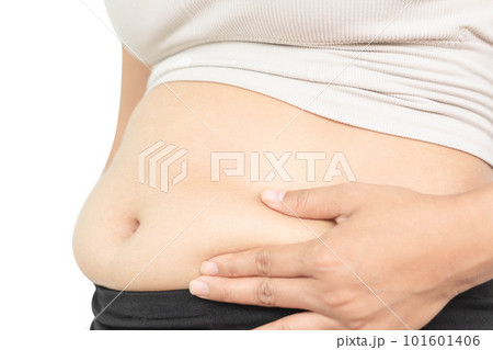 Closeup hand holding abdominal surface woman fat, healthy care and beauty concept