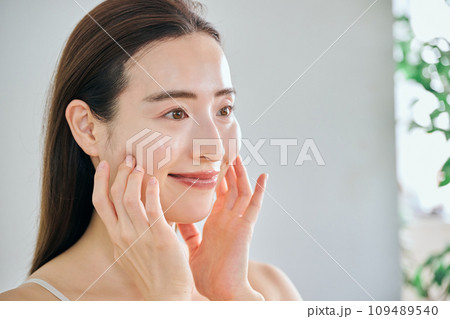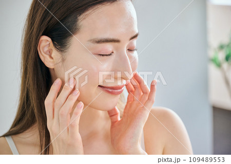 両手で顔をマッサージして肌のお手入れをする30代女性